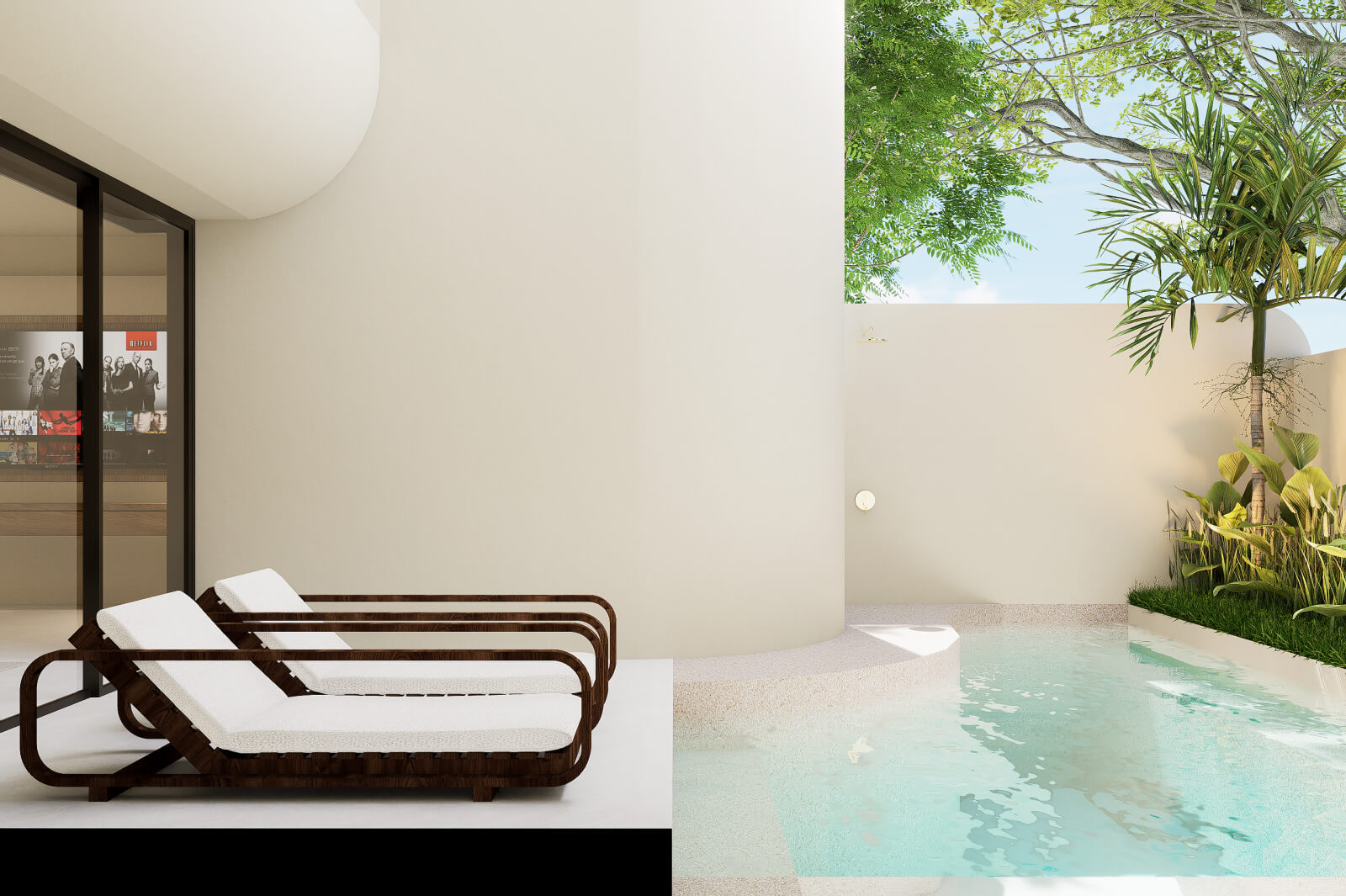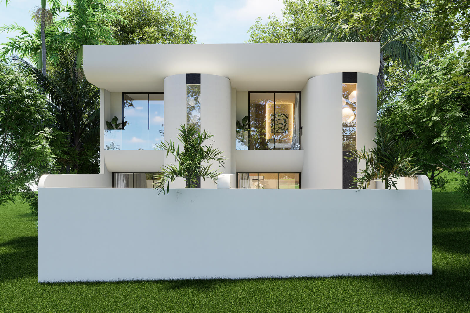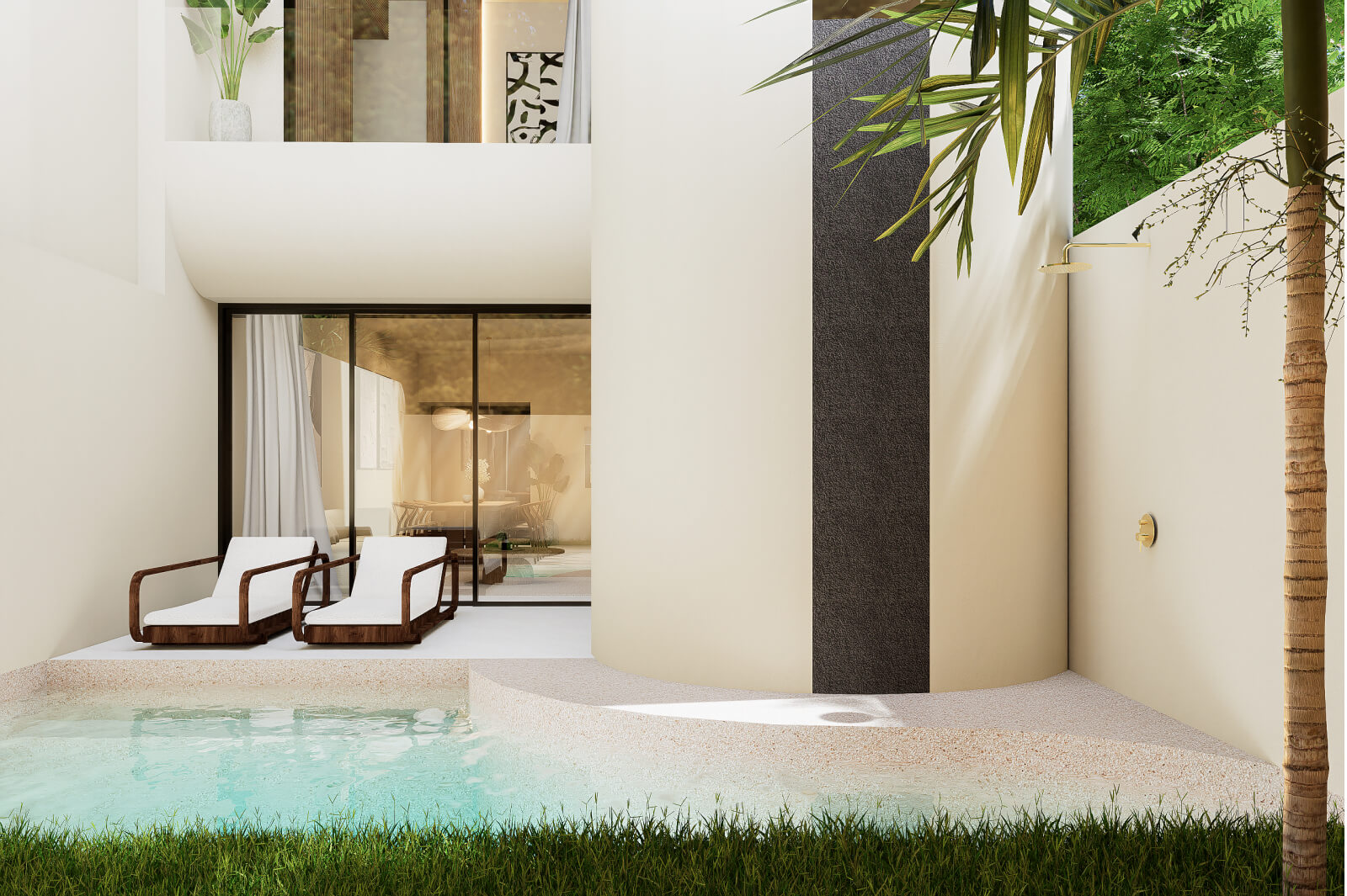 Since the property is designed for a diverse rang e of buyers, we have tailored the design to suit both short - term and long - term residents, ensuring it is visually pleasing and well - suited for family living. Each unit features two bedrooms located on the first floor, while the ground floor focuses on comm unal areas and activities. By omitting parking space for cars, the ground floor becomes more spacious than similar - sized properties, allowing for a displayable kitchen island and a generous pool terrace. Given that all bedrooms are situated on the first fl oor, we incorporated a balcony for each room to add value, compensating for their distance from the entrance.