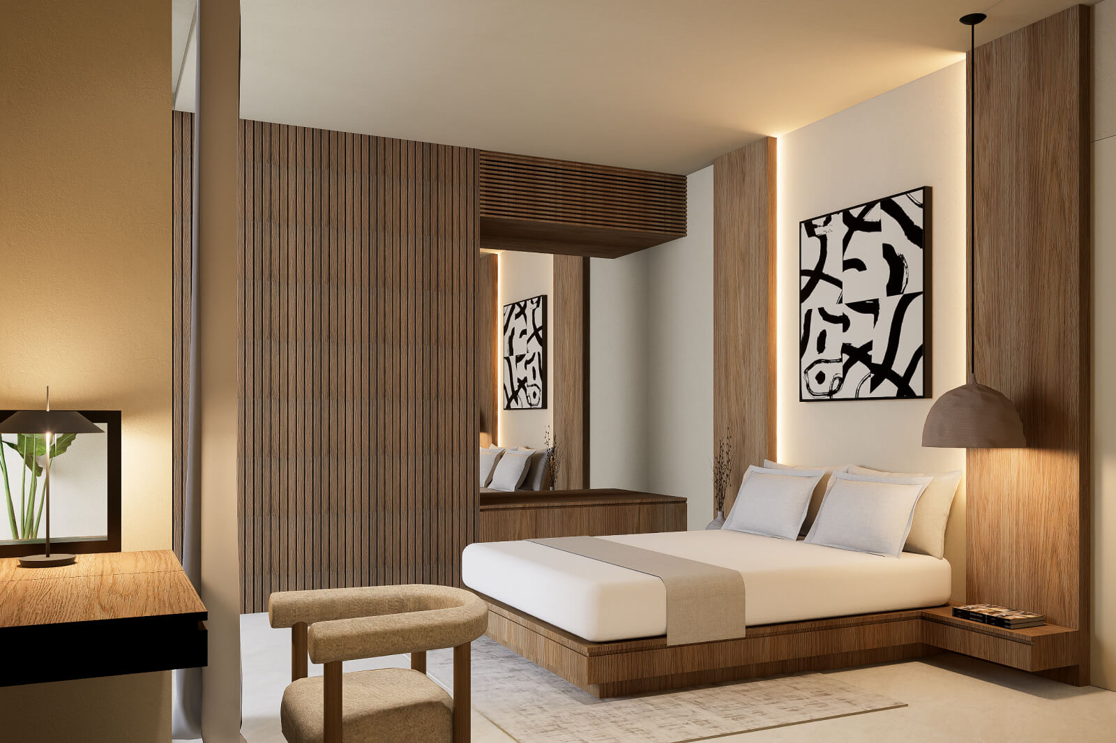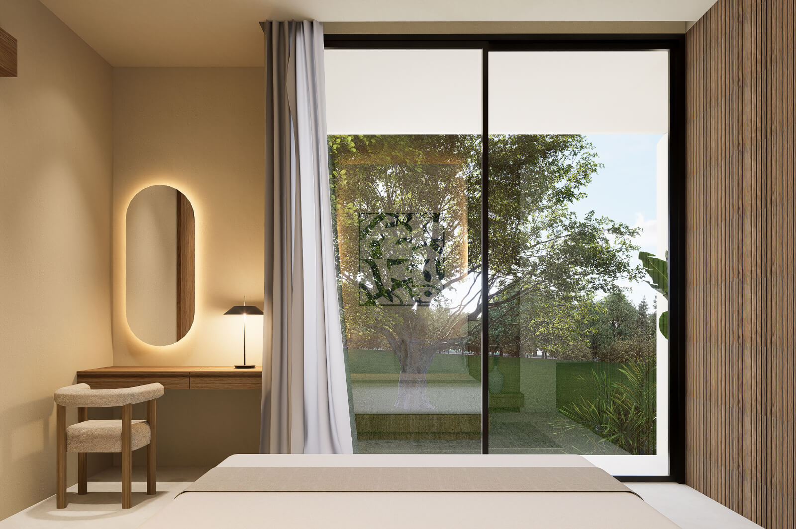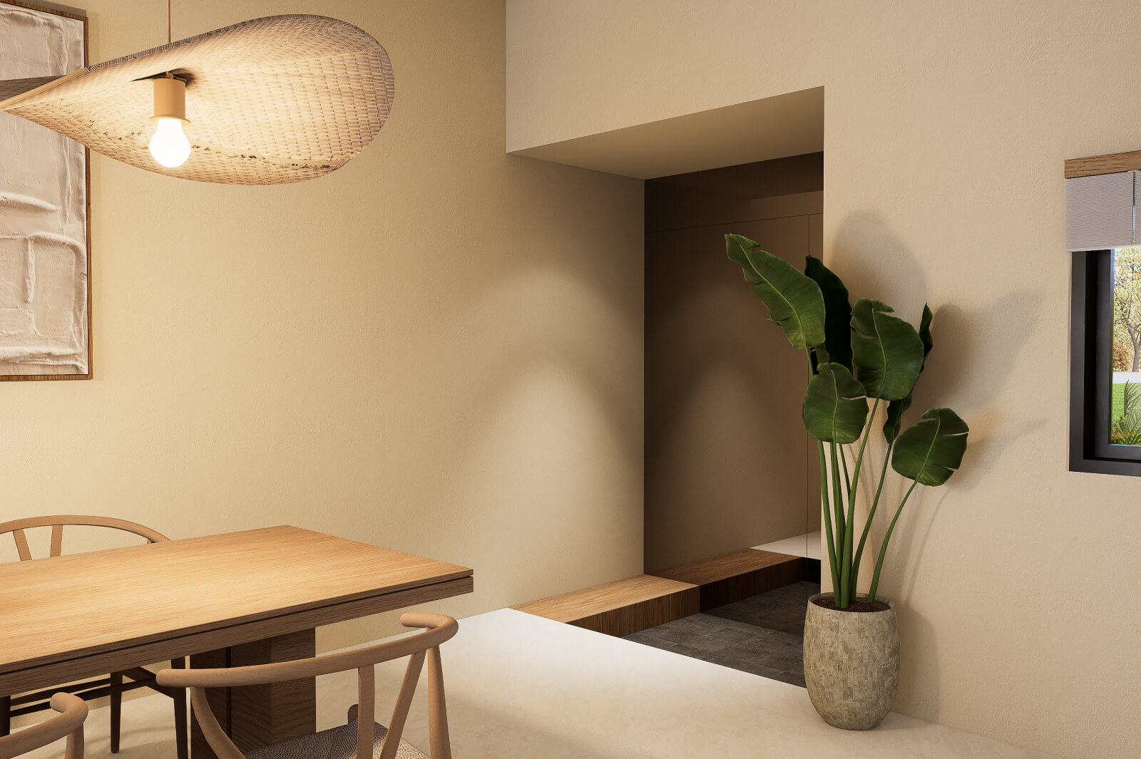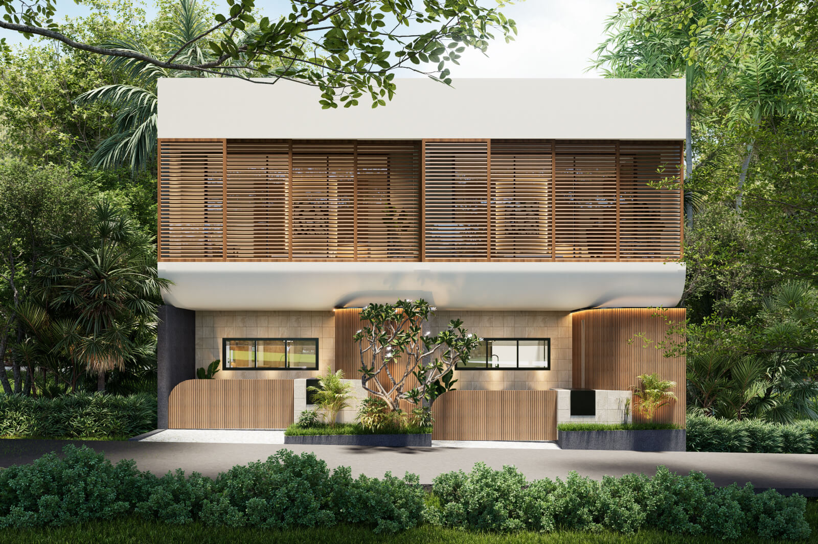 Since the property is designed for a diverse rang e of buyers, we have tailored the design to suit both short - term and long - term residents, ensuring it is visually pleasing and well - suited for family living. Each unit features two bedrooms located on the first floor, while the ground floor focuses on comm unal areas and activities. By omitting parking space for cars, the ground floor becomes more spacious than similar - sized properties, allowing for a displayable kitchen island and a generous pool terrace. Given that all bedrooms are situated on the first fl oor, we incorporated a balcony for each room to add value, compensating for their distance from the entrance.