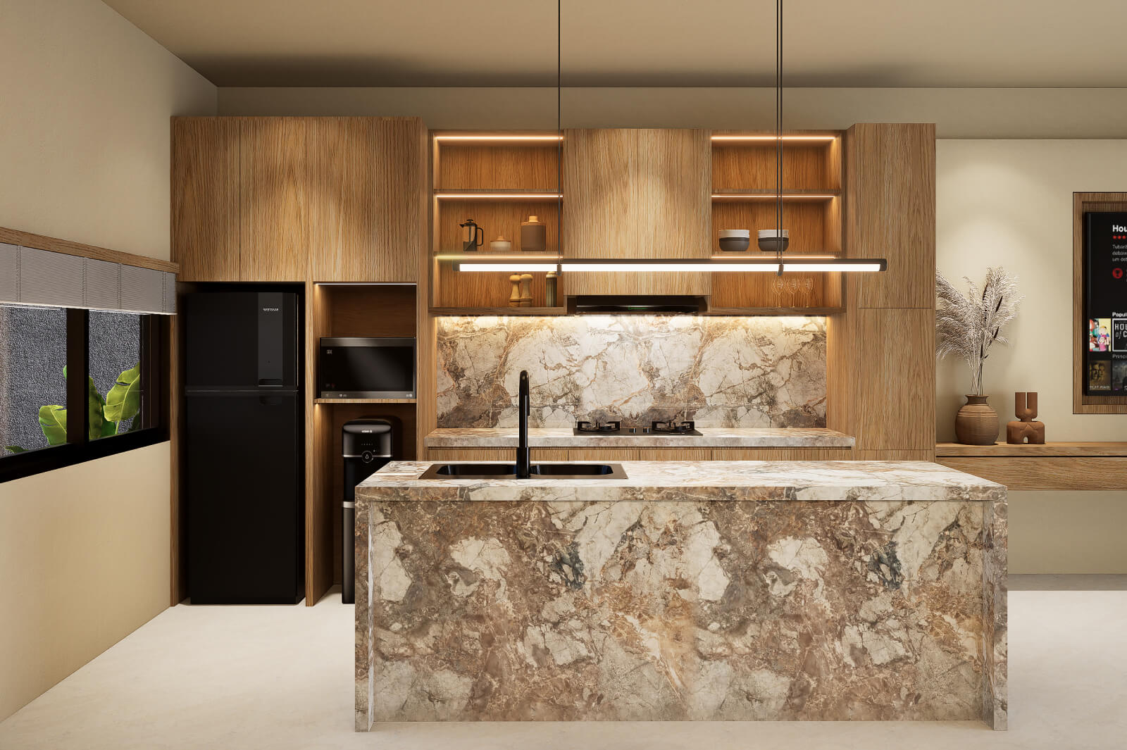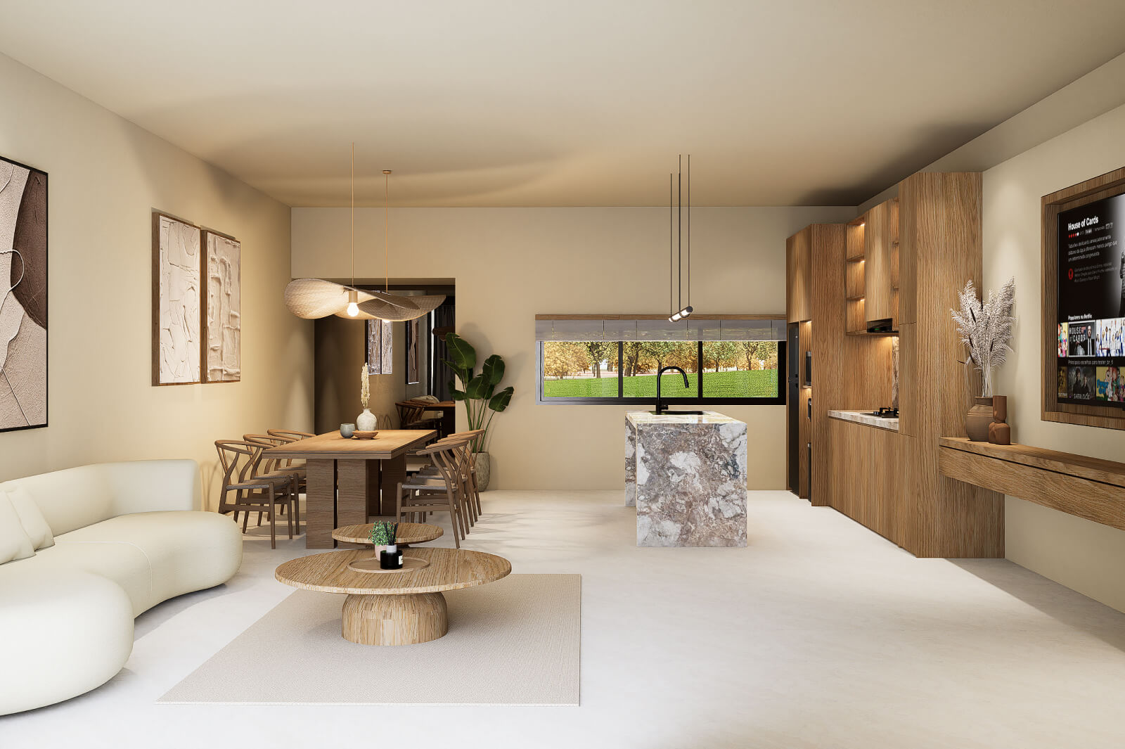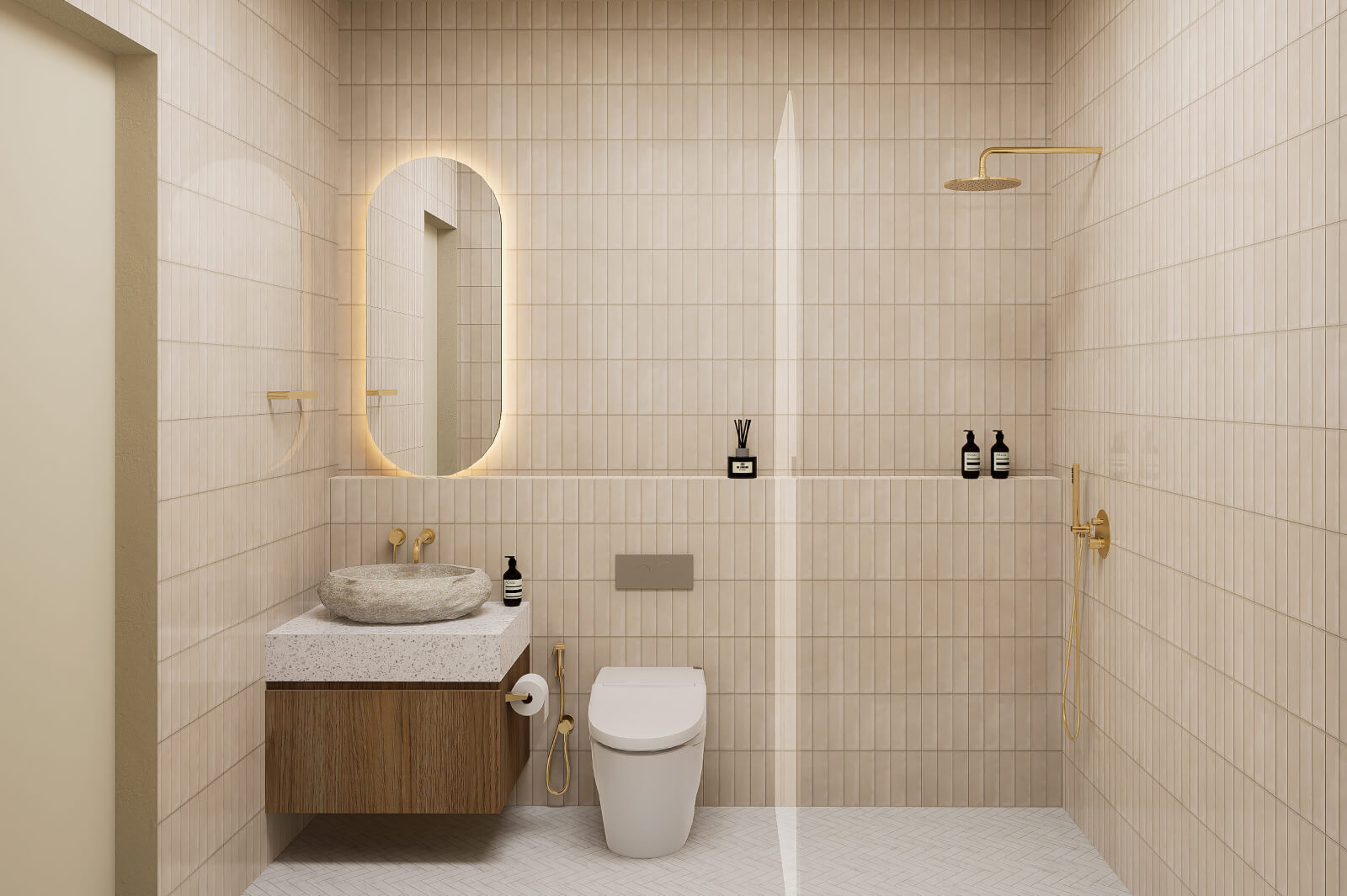 After several site visits and material samples, we decided on an overall cream - toned palette, which allows the bold wood tones of the furniture to blend in while also standing out. Additionally, prioritizing the user and guest perspective led us to enhance key design elements, such as the marble kitchen island and the Venus tile wall in the powder room, making them focal points of the space.